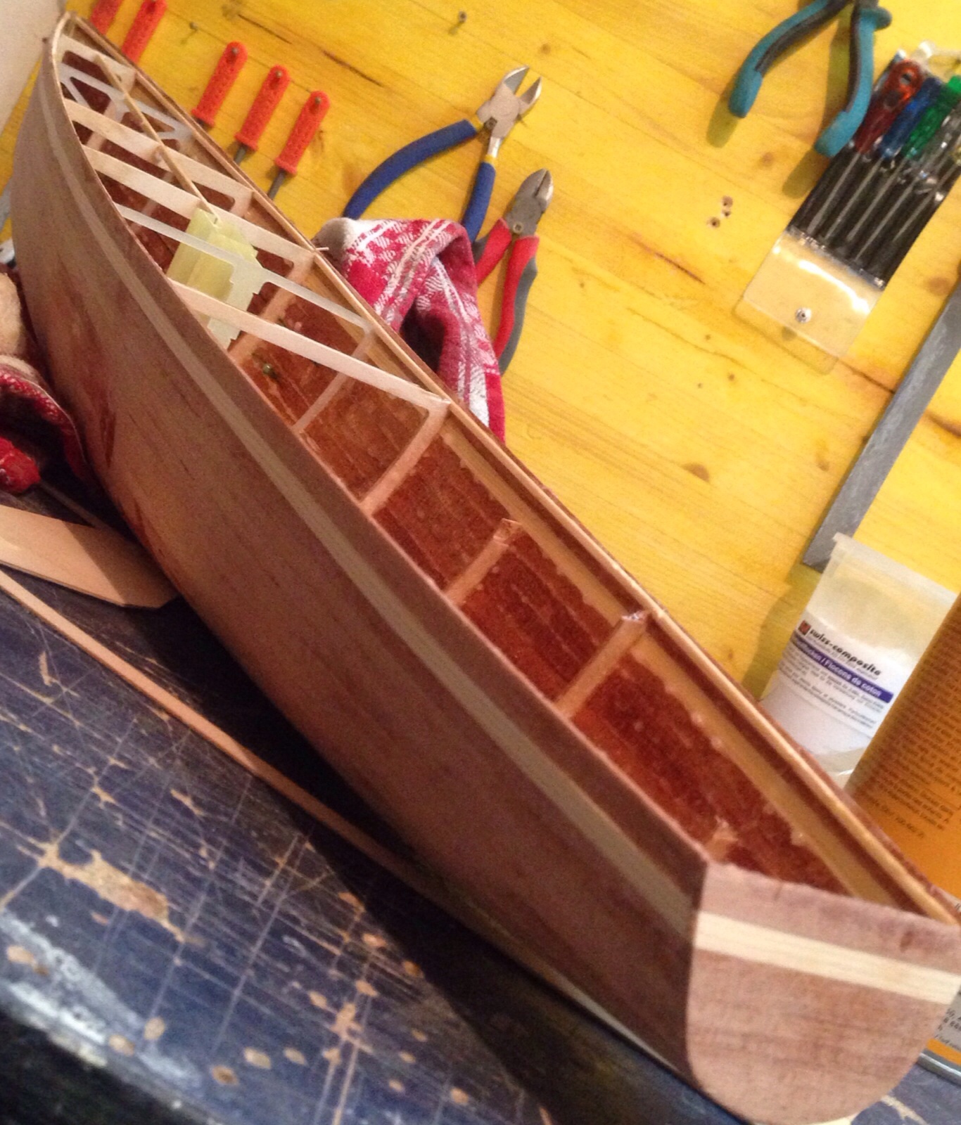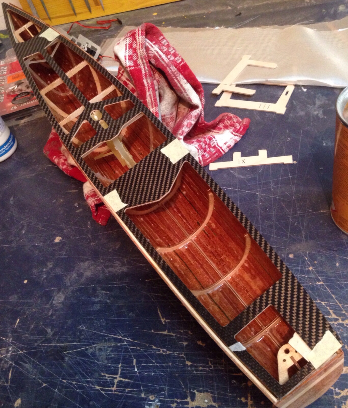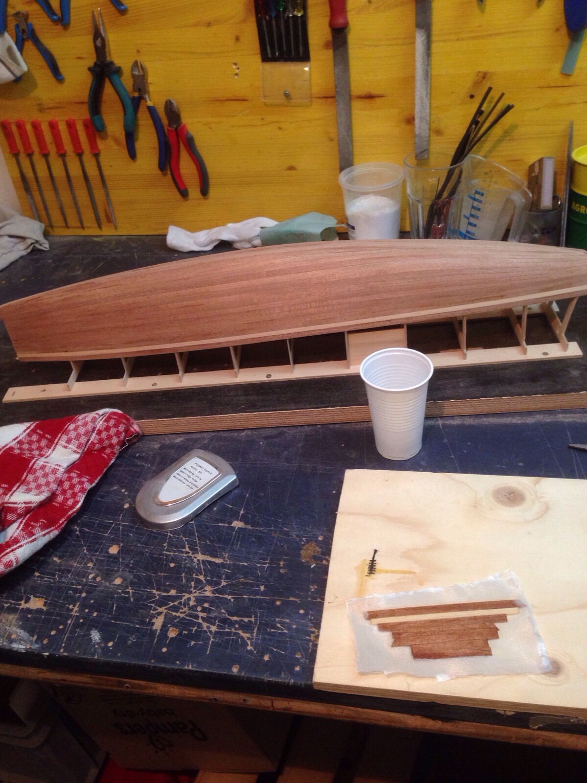 Der Rumpf wird ja mit Mahagoni Planken belegt. Wir bekomme ich am Schluss die schöne rötliche Farbe des Holzes hin? Reicht es alles sauber zu schleifen und dann mit Harz zu überziehen? Muss mal an einer Leiste einen kleinen Versuch starten.