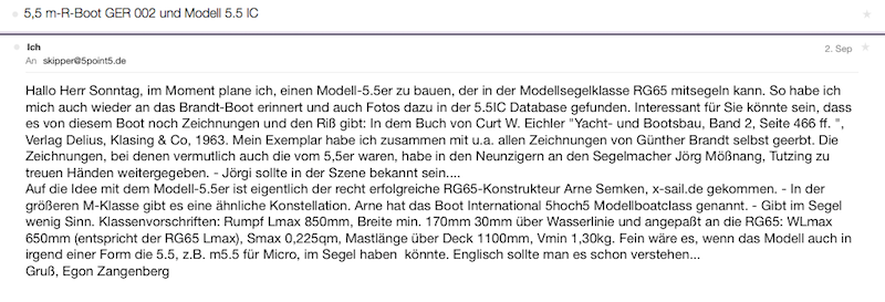 Riß abweichenden flachen Boden. Denn Bootskonstrukteure mögen es garnicht, wenn jemand an ihren Rissen was ändert. Deshalb würde ich auch raten, Modelle nach Vorbildern mit Genehmigung der Urheber möglichst im Maßstab zu bauen. Hier 1:11, damit die Modelle in Arnes Klassenvorschrift passen. Und wenn wir schon bei den Rechten sind, dann mach mal die Datei auf: Darauf hat mir gestern Kaspar Stubenrauch, President der INTERNATIONAL 5.5 CLASS ASSOSATION geantwortet. Er schlägt uns im Segel die 5.5 der Vorbilder mit nem