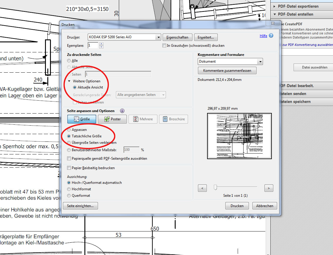 Du kannst im Druckdialog die aktuelle Ansicht und die tatsächliche Größe festlegen.