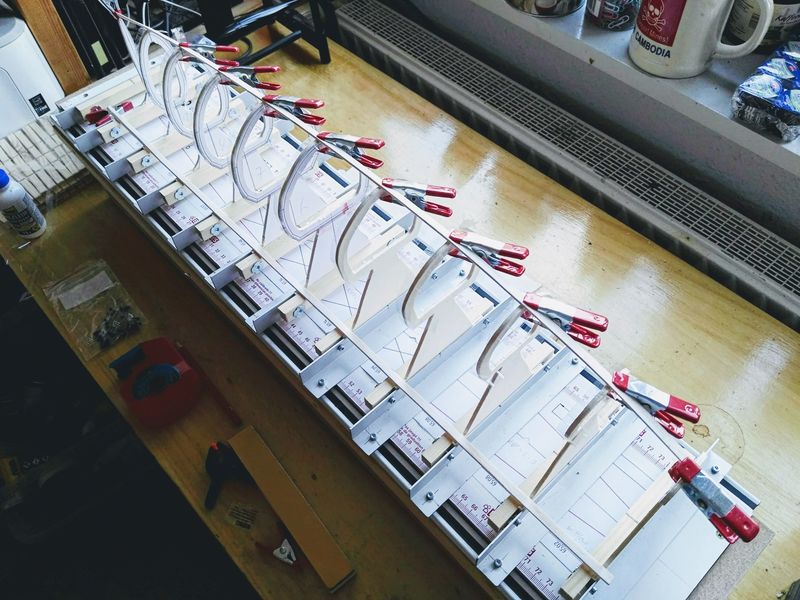 Es ist vollbracht! Die ersten Schritte zum selbst gebauten Boot sind getan und nun stehen die Spanten schön ausgerichtet auf Helling. Wie schlank das Teil doch im Vergleich zu meiner DF ist!