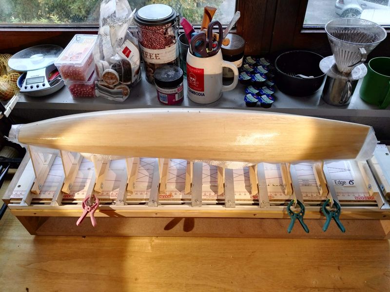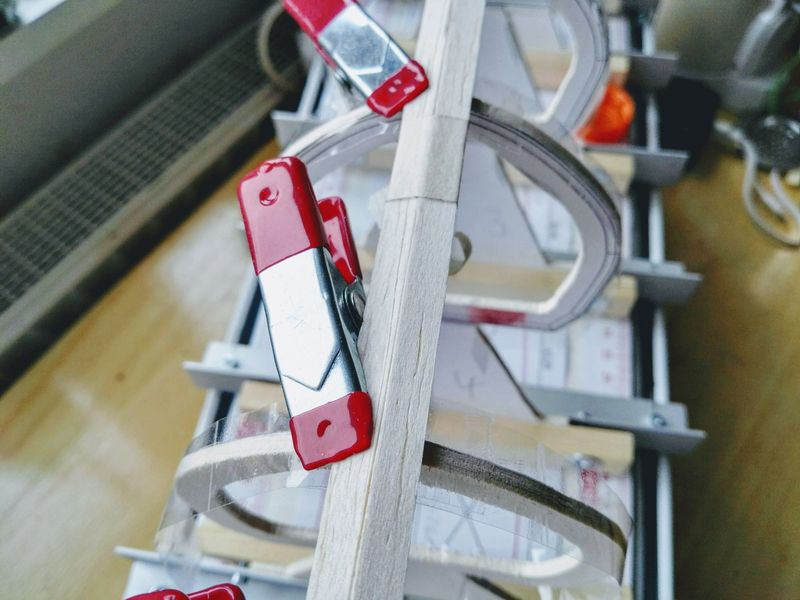 Übrig blieben nur die Modellbauklammern von Revell/Wolfcraft. Die roten Metallklammern drückten Dellen ins Balsa und Wäscheklammern, zumal aus Holz, scheinen mir gänzlich ungeeignet - es sei den man steht auf Boote mit angeleimten Klammern