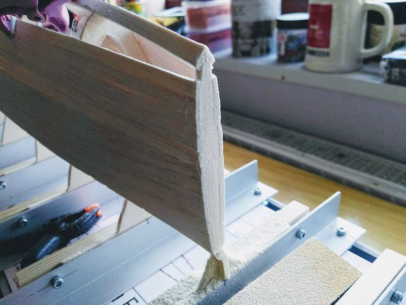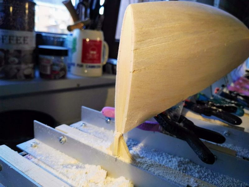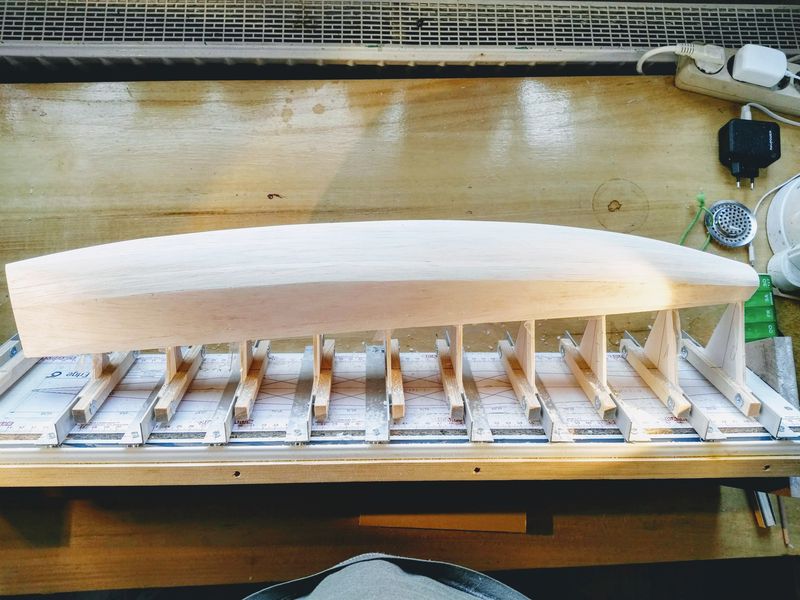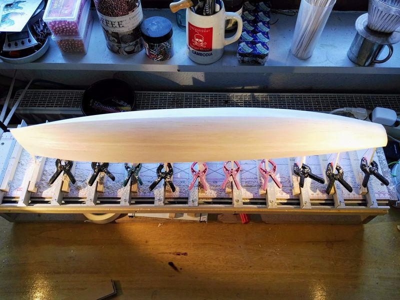 Sooo, alle Planken sind drauf und der Rumpf hat seinen ersten Schliff bekommen. Als letztes habe ich noch den Spiegel aus 0,8 mm Sperrholz aufgeleimt und der bindet gerade ab.