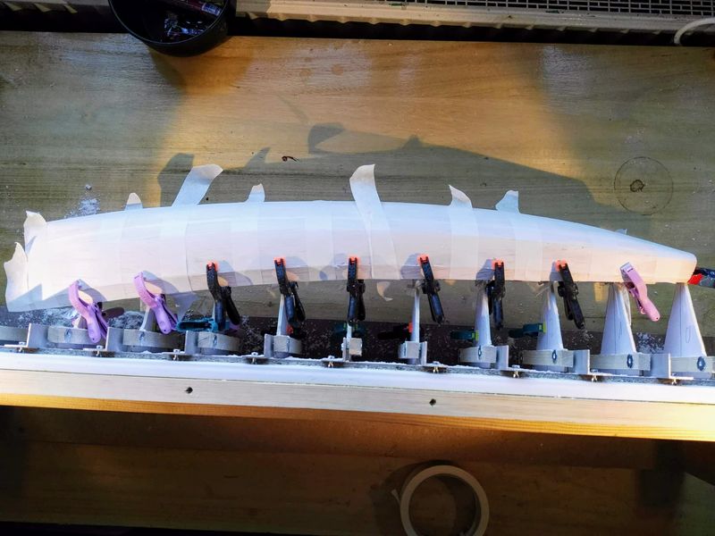 Es ist ein tolles Gefühl, wenn sich ab irgendeinem Moment die Form des Rumpfes deutlich abzeichnet. Hab 'ne ganze Weile davor gesessen und diese harmonisch rassigen Linien bewundert. War für mich schon ein besonderer Moment. Ist das nur beim ersten Rumpf so?