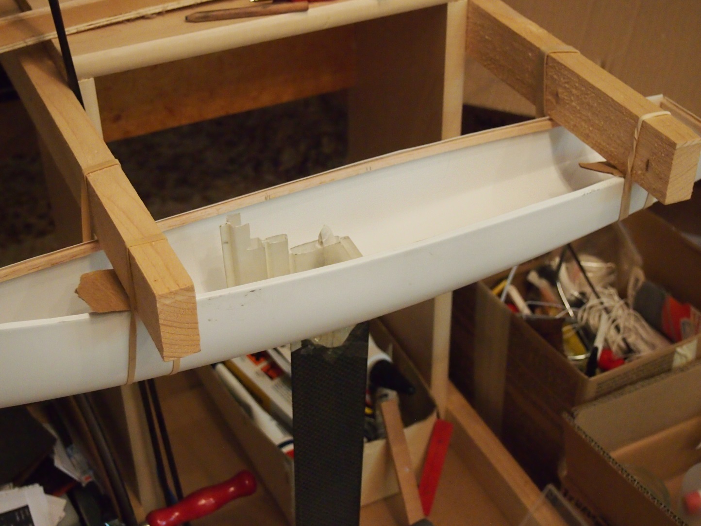 Balsa Verstärkungen in den Rumpf geklebt, überstehenden Rand komplett abgeschnitten. Das Deck wird also komplett auf die Leisten geklebt werden. Da stellt sich mir die Frage ob ich einen kleinen Überstand-Material stehen lassen soll. Allerdings wird das überstehende Teil dann später zu sehen sein. Oder sollte ich Randgenau trennen, dann aner ist die Materialkante zu sehen. Diese müsste dann extra verspachtelt werden. ?