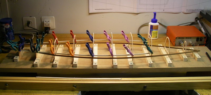 Ich habe nämlich bei meinem letzten Boot auch überlegt, die Planken zu den Enden hin gleichmässig so zu verjüngen, dass ich auf allen Spanten die gleiche Anzahl Planken zu liegen habe. Leider ist mir keine Idee gekommen, wie ich mit vertretbarem finanziellen Aufwand zu einer Vorrichtung komme, die Planken mit entsprechender Genauigkeit zuzurichten. Sie sollen ja auch nahtlos aneinanderpassen. Mir fiel da Lasern oder Fräsen der Planken ein oder eine gelaserte oder gefräste Schablone aus Blech, in die man die Planken zum Schleifen einspannen kann. Wie gesagt - alles viel zu teuer. Du scheinst da ja eine relativ einfache Lösung zu haben. Allerdings kann ich auf dem Foto nicht erkennen, wie sie genau funktioniert.