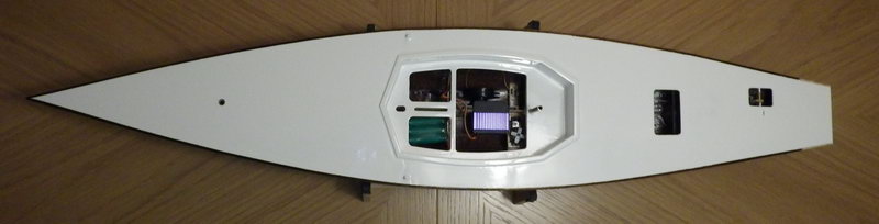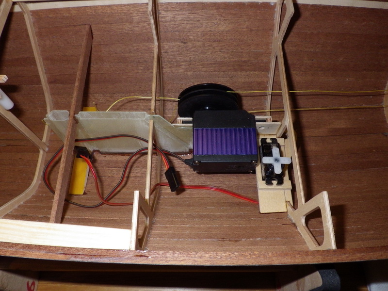 Das Boot ist nun fertig, RC-Einbau komplett mit Schalter. Die Oeffnungen möchte ich mit weisser Folie abkleben, da das Cockpit dicht sein muss. Allenfalls eintretendes Wasser sollte über die Kieltasche abfliessen können. Mit der Seilwinde bin ich bis jetzt zufrieden, ich denke die Geschwindigkeit ist auch ok. Jetzt fehlt noch das Rigg, ich möchte auch aus optischen Gründen ein Rigg mit Saling und Wanten bauen.