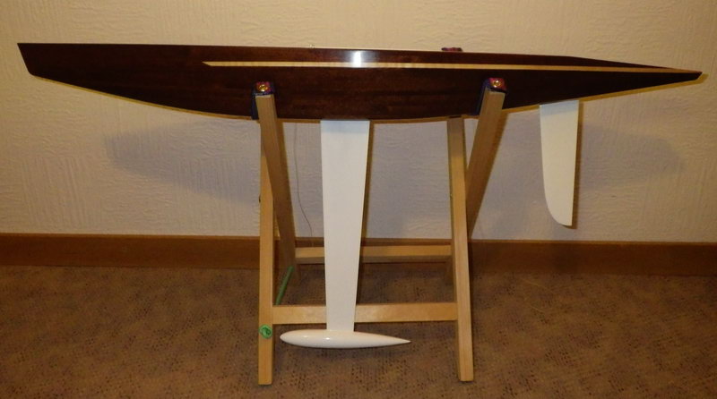 Das Boot in Sichtholz zu bauen war nicht ganz einfach, die Knicke und geraden Flächen sind eine Herausforderung. Ich hatte mich entschieden, den Bau beim Knick unterhalb der Deckskante zu beginnen und an dieser Stelle eine Zierleiste aus Ahorn gesetzt. Von da an habe ich mich nach Oben und Unten gearbeitet. Die Schwierigkeil lag im Bugbereich und dem unteren Knick. Da ich meine Planken immer verjünge, musste ich bis zu dieser Zone einen geraden Plankenverlauf erreichen. Dafür benötigte ich 3 Plankenschablonen.
