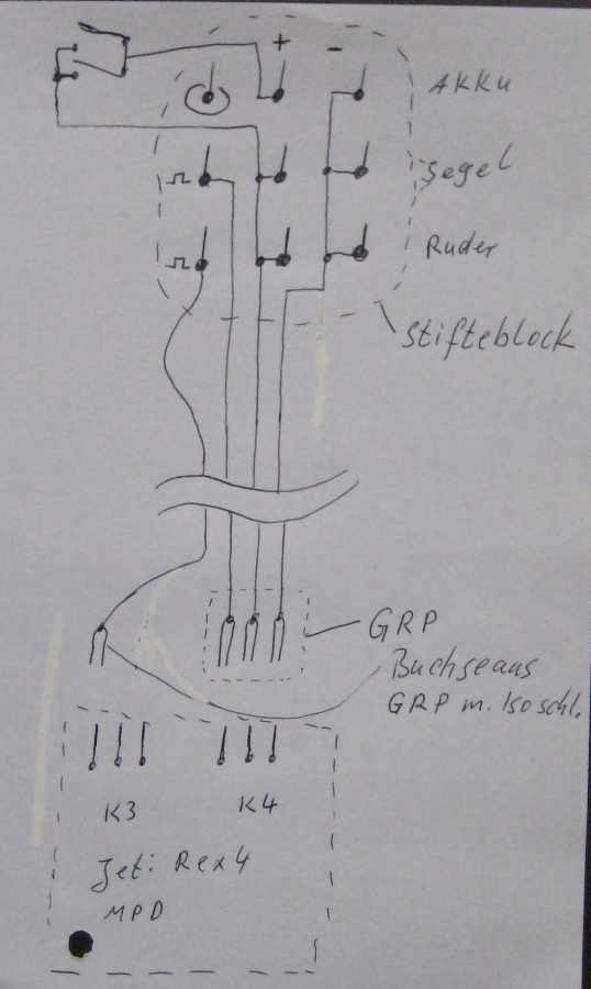 Der GRP Stecker kommt auf den Platz für das Segelservo, der einzelne kleine Stecker auf den Impulskontakt vom Ruder Ruderservoausgang am Super, Segelservo und Akku werden am Stifteblock gestöpselt. Die Servos bekommen direkt vom Akku die Stromversorgung und über das Kabel zum Segelservoausgang beim Super bekommt dieser seine Versorgungsspannung vom Stifteblock.