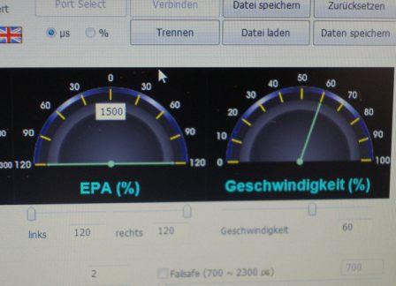 Bei meinem Test habe ich mit der Graupner Servo Setup Software EPA links/rechts auf 120 % eingestellt. Die Geschwindigkeit wurde auf 60 % programmiert.