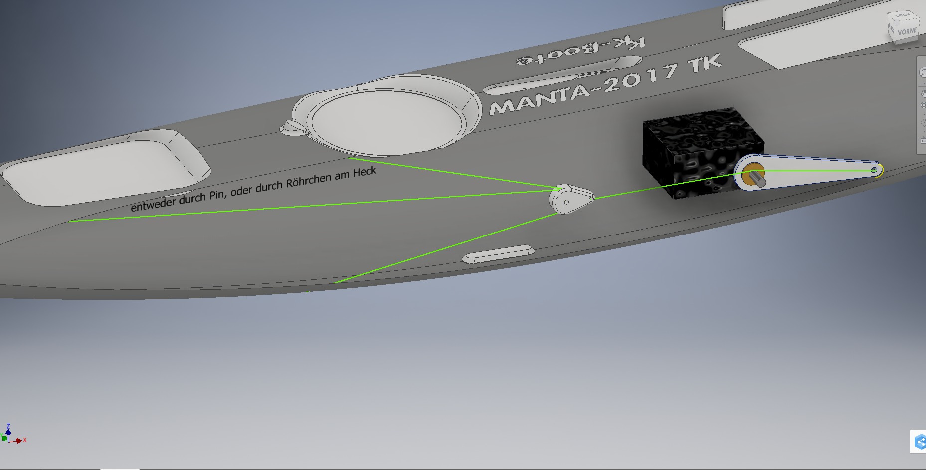 Höher einbauen ändert aber nix, mehr als 180° Servoweg kann man nicht ausnutzen weil der Schotweg dann wieder in die andere Richtung geht. Dafür ist der Schwerpunkt des Bootes dann wieder höher. Ziel dieser Einbauposition des Servos ist das Ding so tief wie möglich zu bekommen. Darum auch der liegende Einbau....