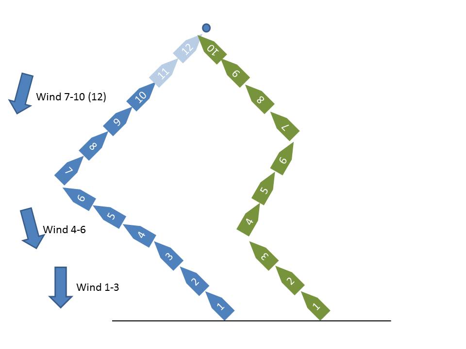 ...auf die Schnelle mal eine kleine Skizze...der Wind dreht leicht. Das grüne Boot nutzt jede Drehung optimal aus und wendet entsprechend, während das blaue Boot gegen die Drehungen segelt.