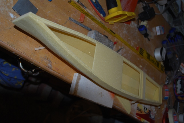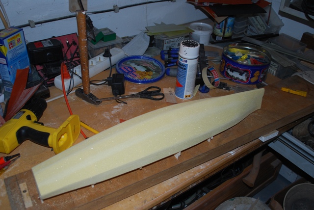 meine rumpfschale ist soweit fertig. gebaut mit 3mm airex. also ich würde sagen wenn man einen schnelltrocknenden kleber verwendet ist das eine schöne feierabend beschäfftigung und nicht nur vom wiesel an einem abend gemacht.hat spaß gemacht.