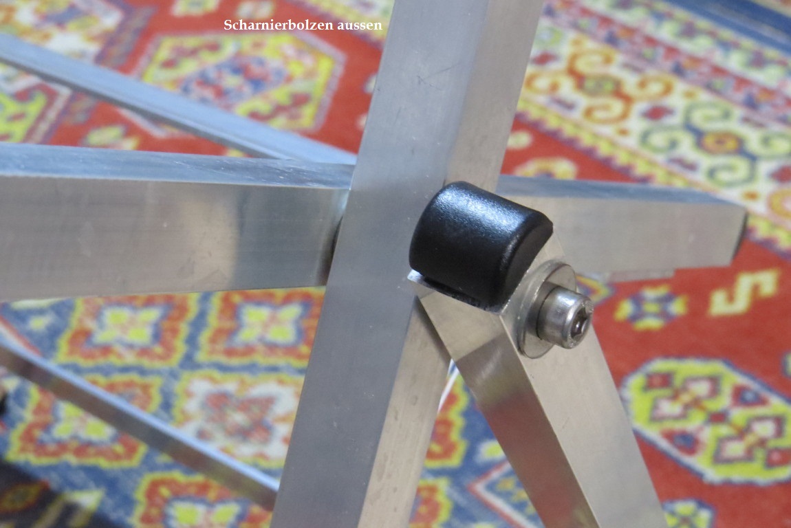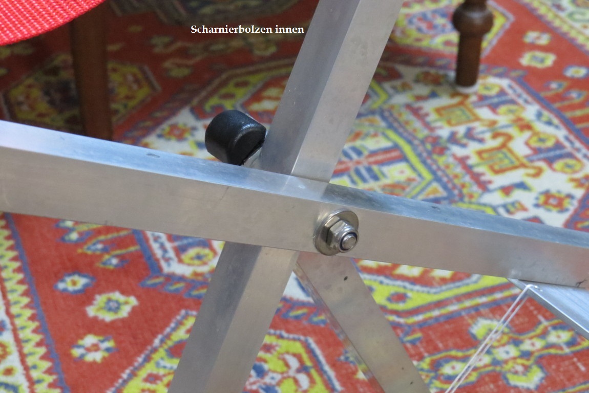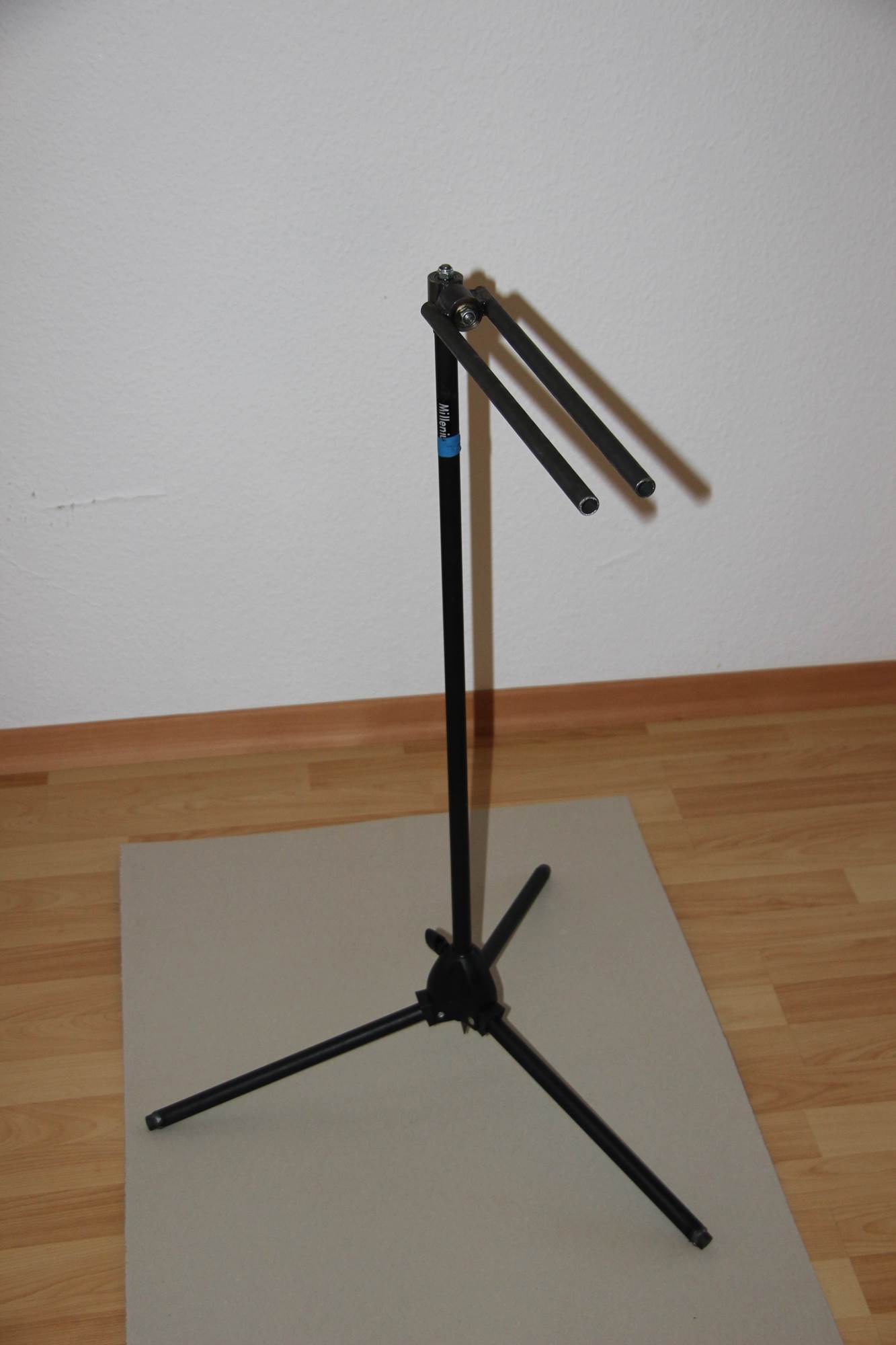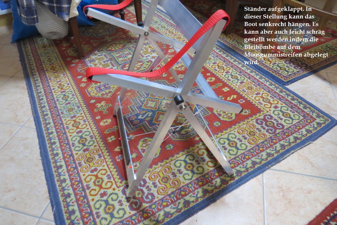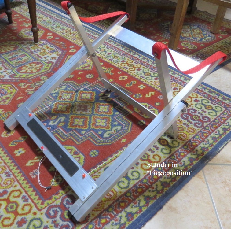 das mach ich doch glatt. Es sind zwar Bilder von meinem IOM-Ständer. Und es ist eine Ausführung mit Gurten statt Konsolen (wie im Bauplan). Aber das ändert am Funktionsprinzip ja nichts.