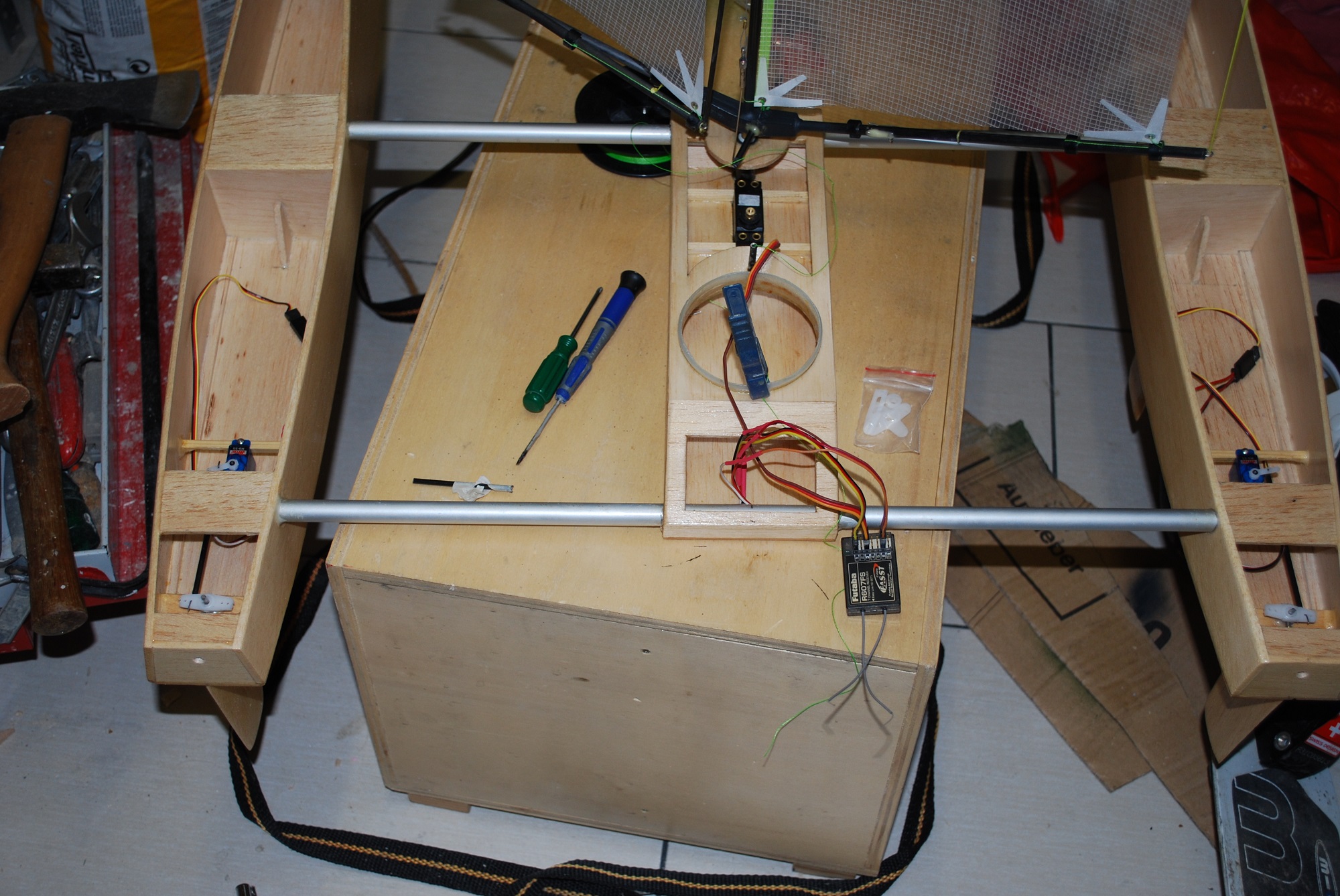 Da ich mit Deckel arbeiten und die Schotwege möglichst kurz halten wollte habe ich einen Kasten gebaut in dem alles schön Platz hat.