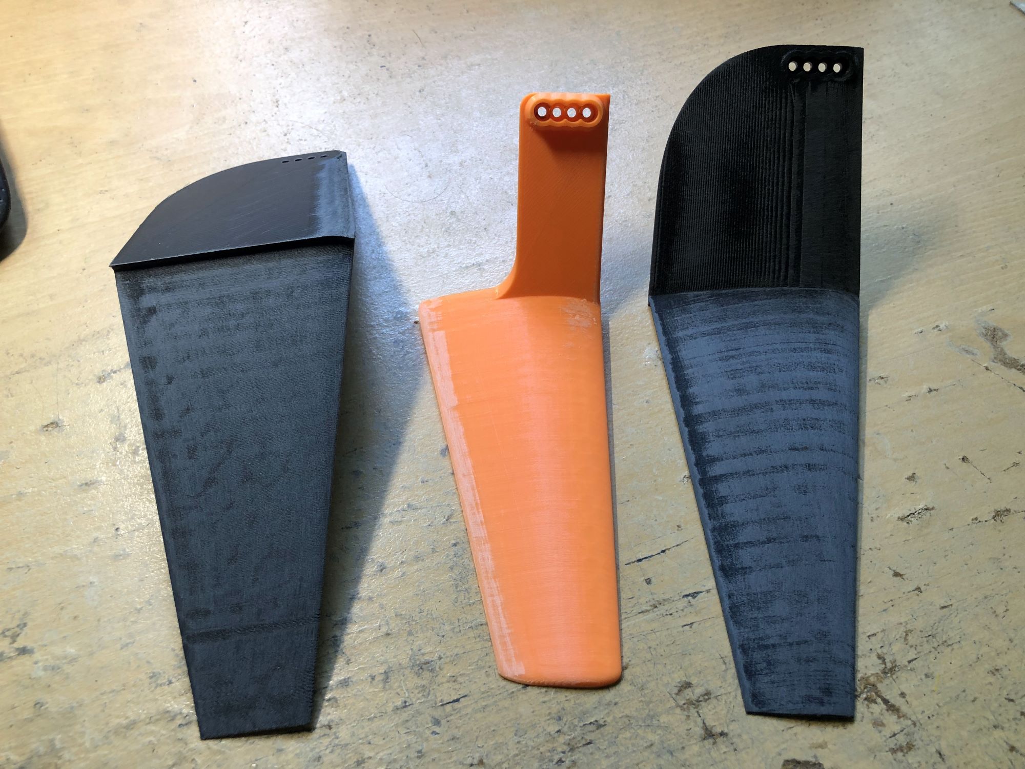 Daher wurden schnell ein zweites Paar Foils designt und gedruckt. Weil das Biegemoment kurz unter der Befestigung doch nicht unerheblich ist würde diese Stelle deutlich massiver gestaltet und auch ein Filament mit CFK Anteil verwendet um mehr Steifigkeit zu bekommen.