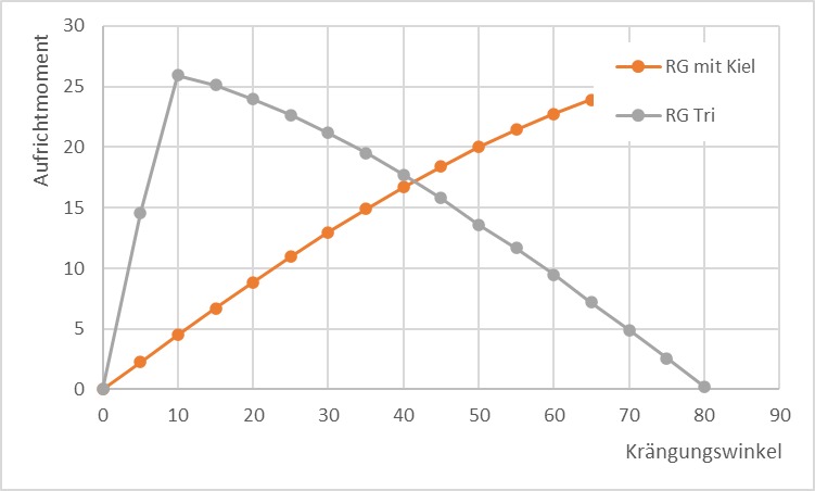 die größere Breite bewirkt ein größeres aufrichtendes Moment. Ich weis nicht wie sich der Wegfall des Kiels auf das Aufrichtmoment auswirkt.