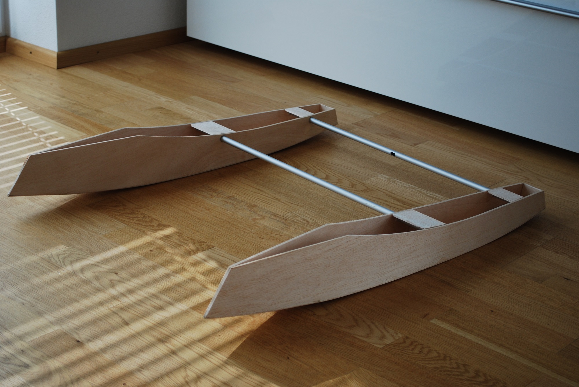 Auf den Fotos wirkt der vordere Beam ziemlich weit hinten. ich hätte da ein bisschen Bedenken was die Torsion der beiden Rümpfe zueinander angeht. Bei den Mini40ern haben die ganzen Boote mit Rohren als Beams das gleiche Problem. Die sind natürlich auch größer und schwerer und es wirken größere Kräfte.