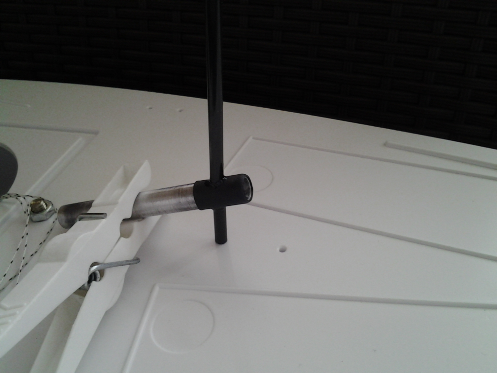 Abspannen muss ich den Mast, die Aufnahme ist nur die Öffnung im Rumpf von 10mm mit einer Cfk Platte (orig. Ist es eine Kunststoffplatte, habe ich getauscht) am Mast ist nur ein Ring, so das der Mast nicht reinrutscht. Also kein Rohr das der von alleine steht.