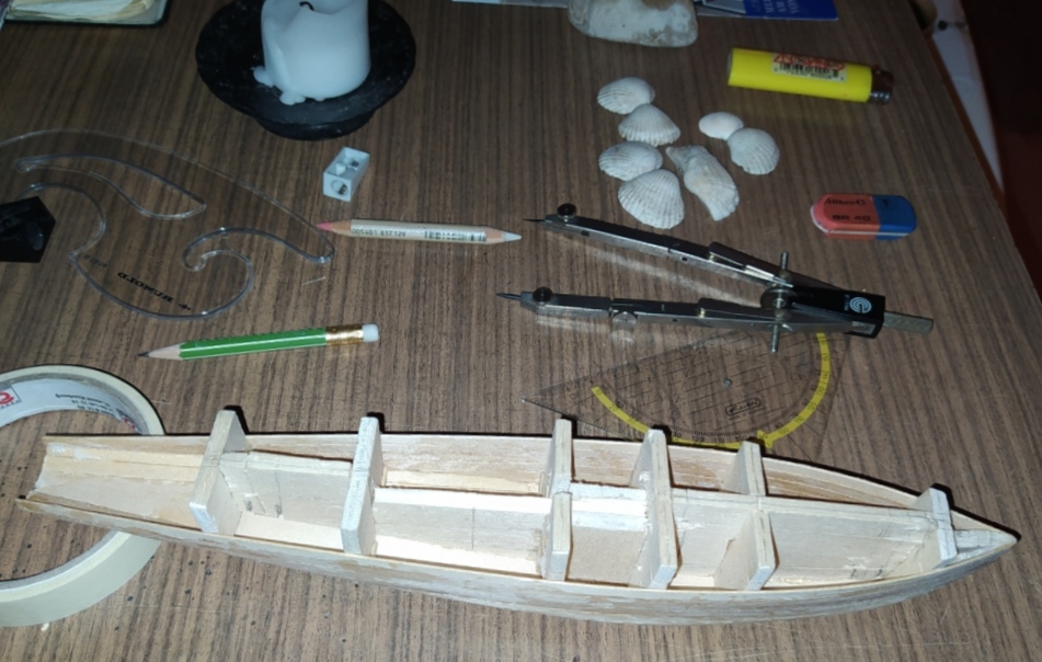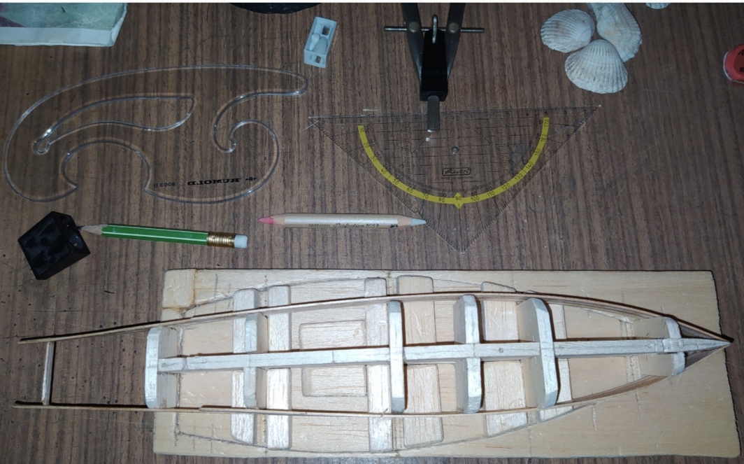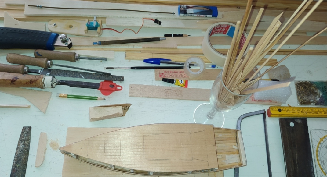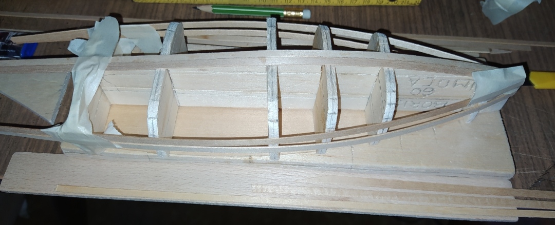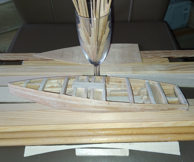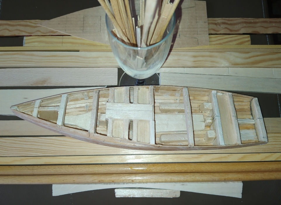 wenn die Mallen entfernt werden, ist das Böötchen durch die Leisten-Beplankung Formstabil. Das Deck gibt die Querstabilität.