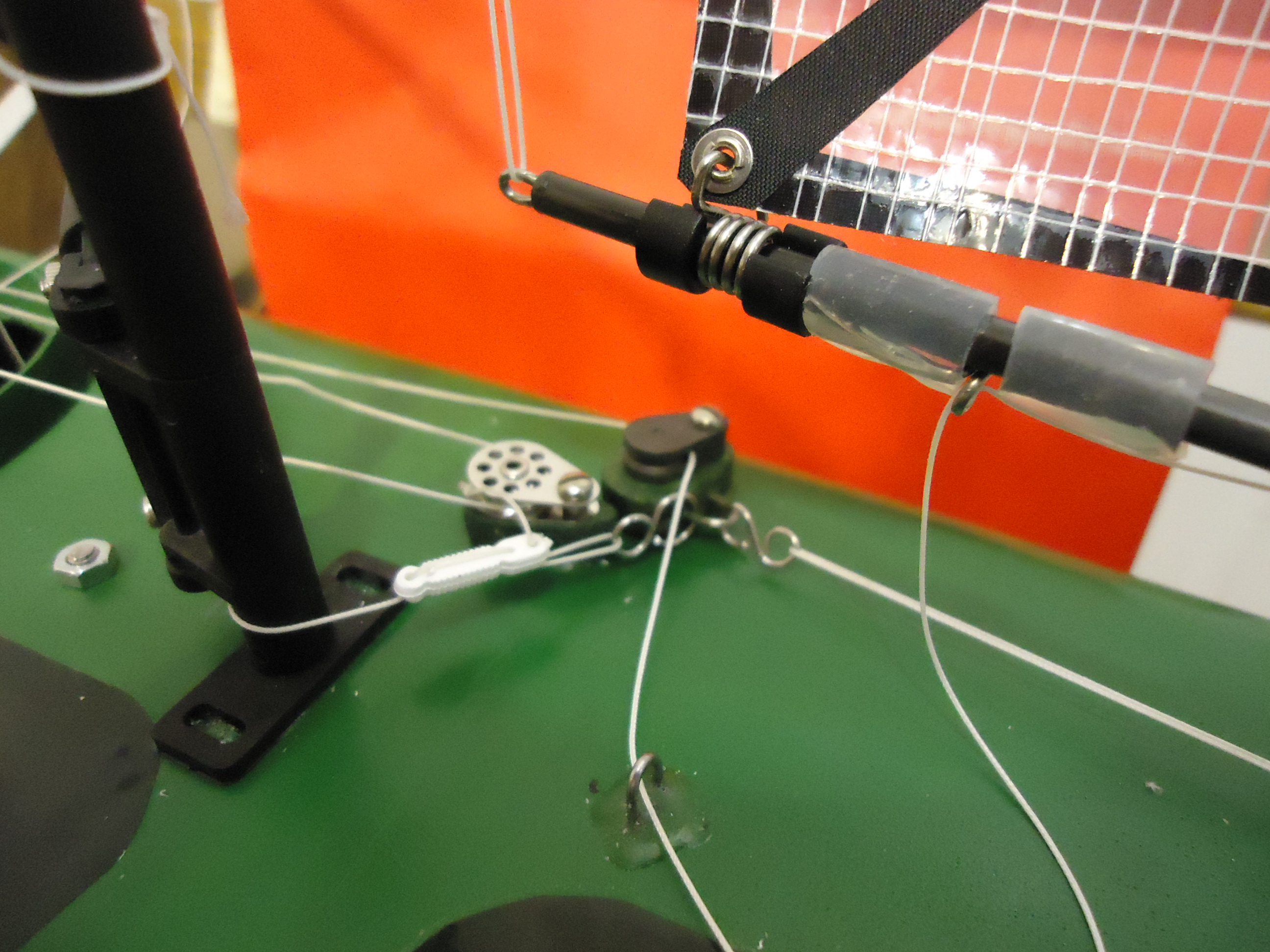 Desweiteren würde ich ganz stumpf hingehen und an den Bäumen und am Mast 1mm Löcher bohren um dort Ösen mit Endfest einzukleben um die Leinen anzuknoten.