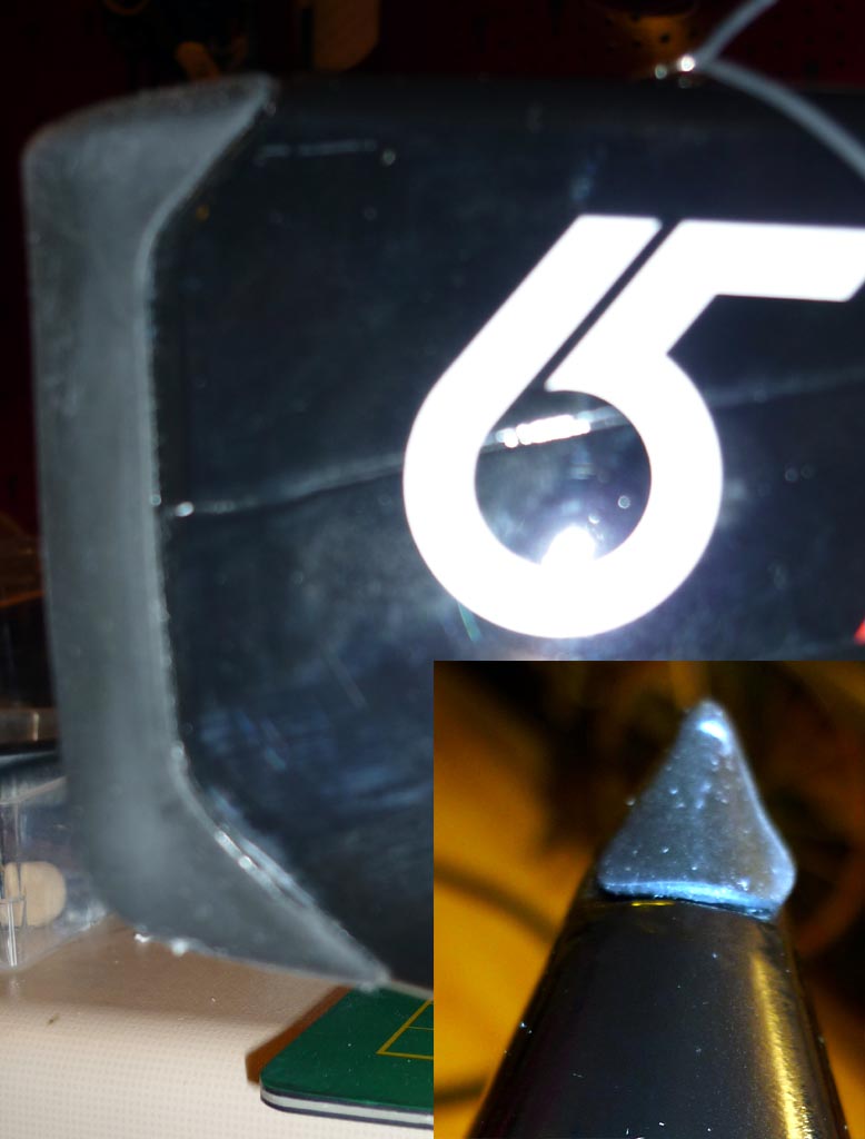 Der Bug mit Bumper, ein recht massiv ausgeführtes Gummiteil, für meinen Geschmack auch zu weit nach unten um den Bug rumgezogen. Die Übergänge und die Verklebung könnten auch schöner sein, schwierig im Photo rüberzubringen aber mal ein Versuch: