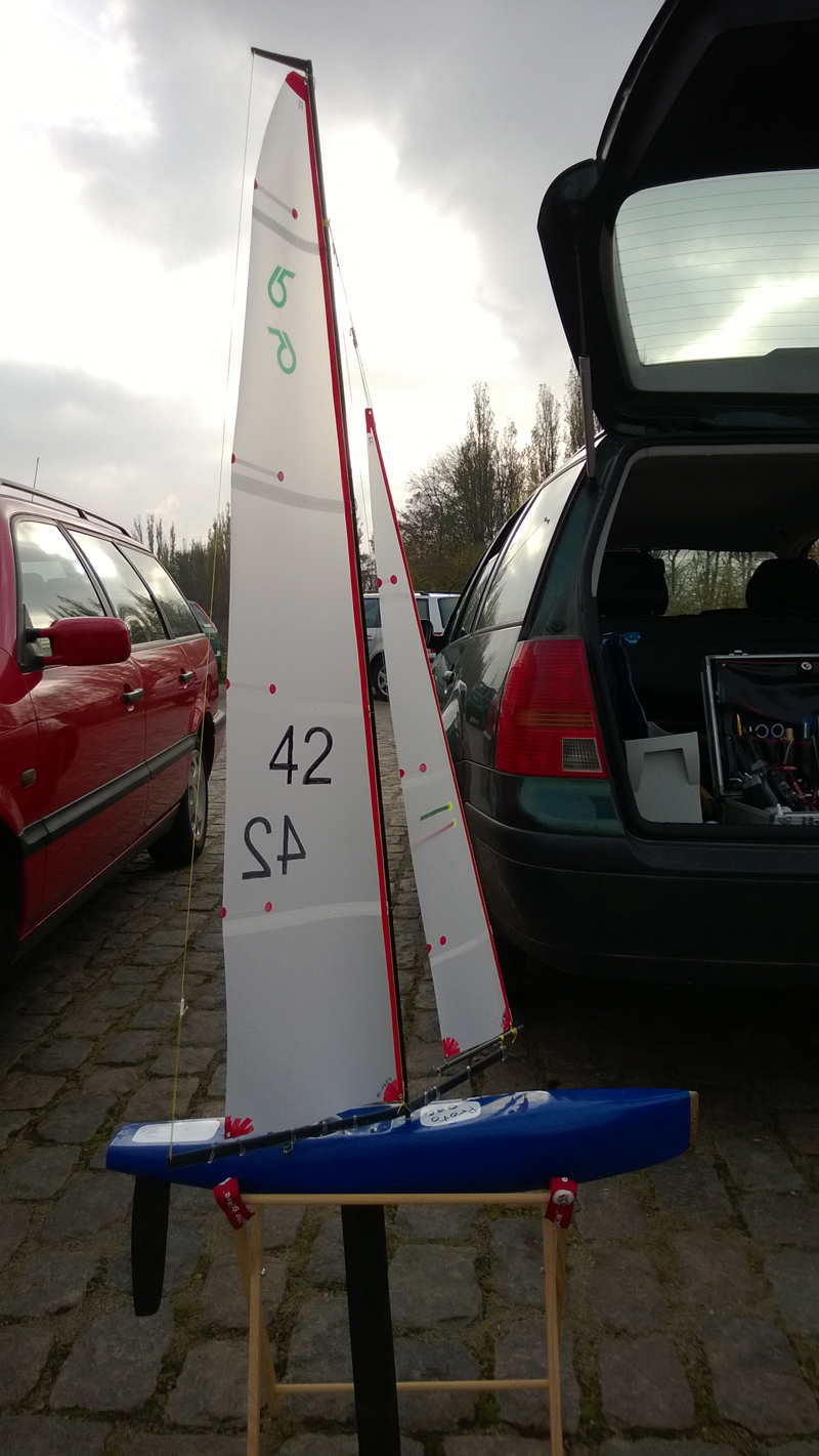 Aktuell ist die Kielfinne weiter nach hinten gekommen und das ehemals verbaute 53mm Alurotorblatt wurde durch eine 47er Finne ausgetauscht. Das Boot fährt besser an der Windkante, schneller ist es scheinbar nicht geworden, das kann aber auch am Rigg/Segel liegen ... im Zweifel auch am Steuermann ;-)