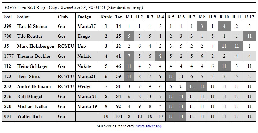hier noch der Rückblick auf die Regatta in Salem. Der Sonntag war vom Wetter her besser als ursprünglich angesagt. Die Sonne durchbrach die Wolkendecke grösstenteils was doch zum einen oder anderen Sonnenbrand führte. Die angesagte Windrichtung trat tatsächlich ein was auf dem zugewiesenen Seeteil zu "speziellen" Verhältnissen führte. Überraschend aufkommende Böen, gefolgt von totaler Flaute waren keine Seltenheit. Auch Winddreher von 90 Grad und mehr überraschten die Segler und mischten das Regattafeld regelmässig durch. Die Nerven der Teilnehmer waren an- bis überspannt. Trotz allem konnten zwölf Läufe gesegelt und ein eindeutiger Sieger auserkoren werden: