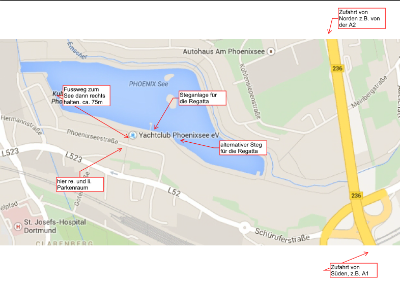 -Das Segelrevier ist der Phönixsee, siehe Detailplan, bzw. für die Anfahrt per Navi am besten Phönixseestraße, 44263 Dortmund, programmieren. Bitte beachten, der Parkraum direkt an der Phönixseestraße hat entgegen des Vorjahres nun eine Begrenzung auf 3h, somit bedenken, wir bewegen uns dort im öffentlichen Verkehrsraum, also entweder nach 3h umparken, oder in der Phönixseestraße ausladen und dann an z.B. der L523-Schüruferstraße parken und 5 Minuten Fussweg kalkulieren. Und bitte nicht mit dem PKW versuchen an der Schranke vorbei zum Ufer zu fahren um `mal eben nur´ auszuladen, so schwer sind unsere RG65 ja nicht ;)