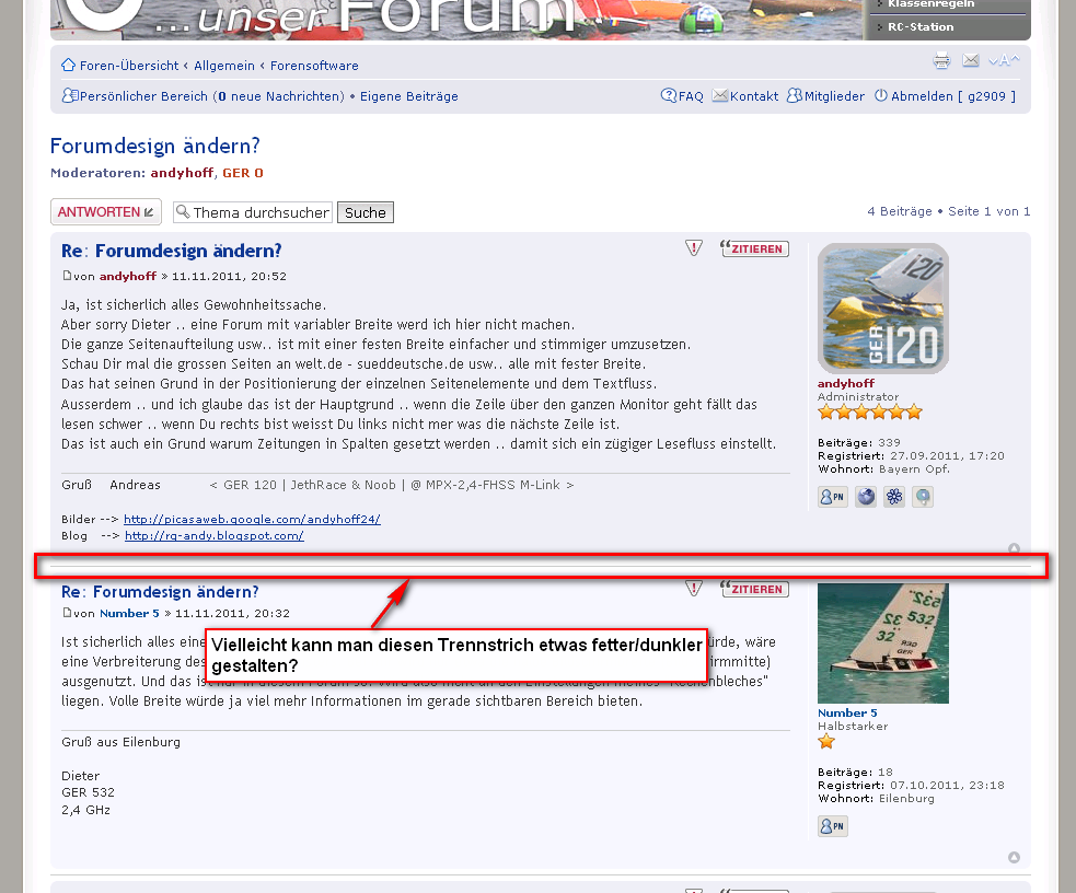 Dieses Forum präsentiert sich momentan total unübersichtlich da muß sich etwas ändern. Ich würde gerne Hinweise geben, was zu tun ist, aber ich weiß es nicht sicher. Auf jeden Fall sollten die Beiträge deutlicher aus dem Drum-Herum hervortreten, also deren Schriftgröße etwas größer eingestellt werden. Hinzu kommt, daß die Abgrenzung zwischen den Beiträgen nicht deutlich hervor tritt. das mag speziell an der (Farb-)Einstellung meines PC liegen. Bei mir treten die einzelnen Farb-Felder bzw. -Rahmen, die die Seite strukturieren, kaum hervor.