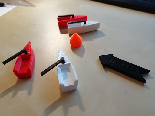 Rumpf mit aufgestecktem, drehbarem Baum, dazu orange Boje und einen Windrichtungspfeil. Somit kann jederzeit eine Situation aufgezeigt werden und das Regelwerk erklärt/diskutiert werden.