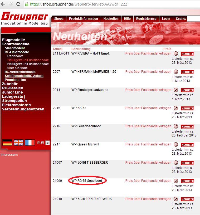 Warum sollte eine rg65 unter der Produktgruppe 'Elektroboote/Naturgetreue-Funktionsboote' eingeordnet sein? Auch die Bezeichnung erscheint mir unglaubwürdig .. die hätten dem Ding garantiert nen richtigen Namen gegeben. Und nicht einfach 'RG 65 Segelboot' hingeschriebenichweissesnicht .. we will see..