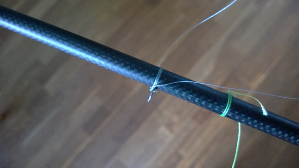 Wichtig dabei ist die Schnur nicht immer um das Rohr zu wickeln sondern durch den Ring um den Baum, durch den Ring und andersherum wieder um den Baum. Das machst du vier, fünf mal so, dann knotest du die Schnur fest. Die Knoten machst du im Bereich des Ringes, dadurch stellt sich der Ring automatisch auf. Wichtig ist das der Ring im 90° Winkel zum Rohr seht. Anderfalls öffnet sich das Rigg zu jeder Seite unterschiedlich weit, das heißt dein Boot fährt auf einem Bug mehr Höhe als auf dem anderen. Zum Schluß den Knoten, am besten die ganze Schnur, mit Sekundenleber sichern.