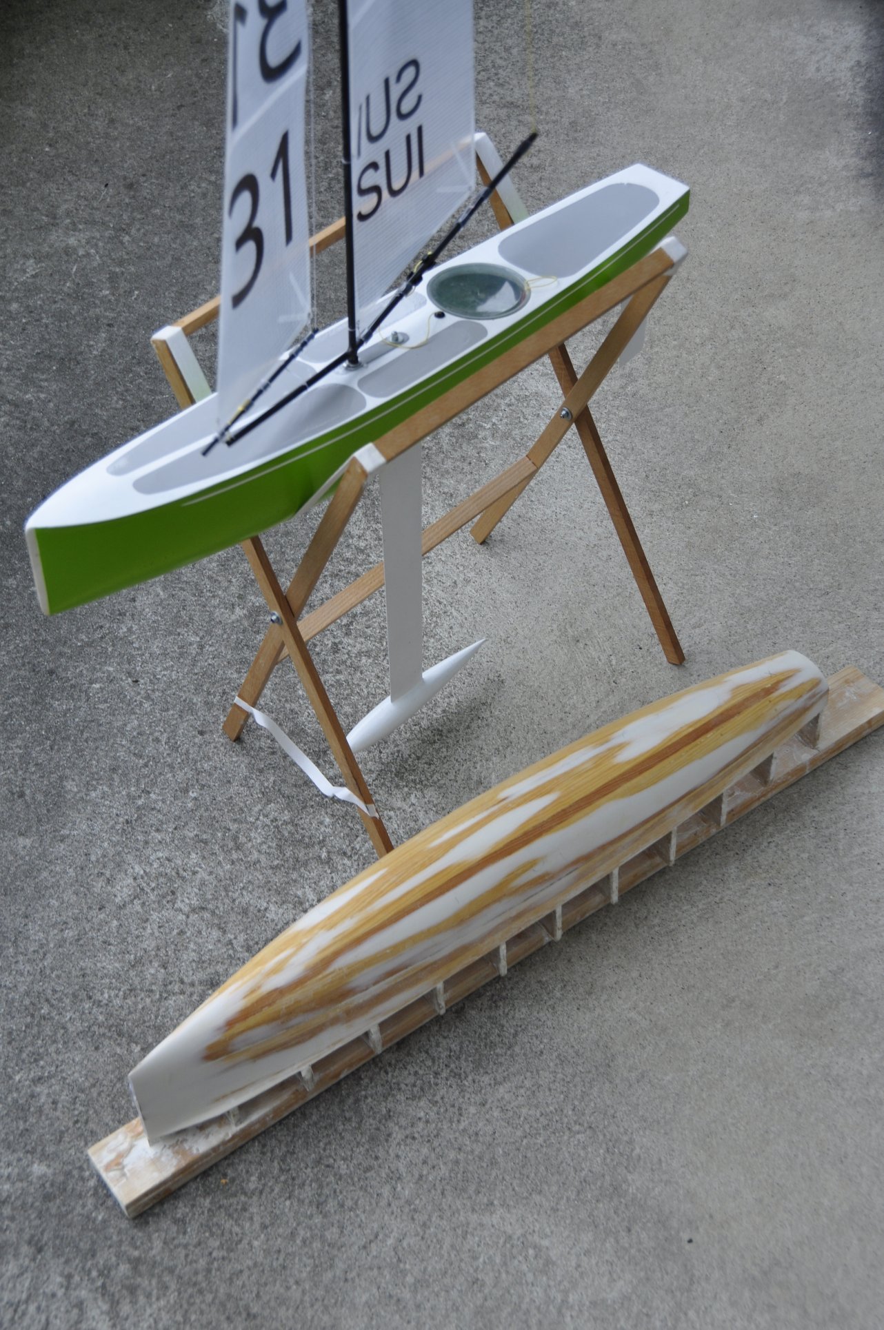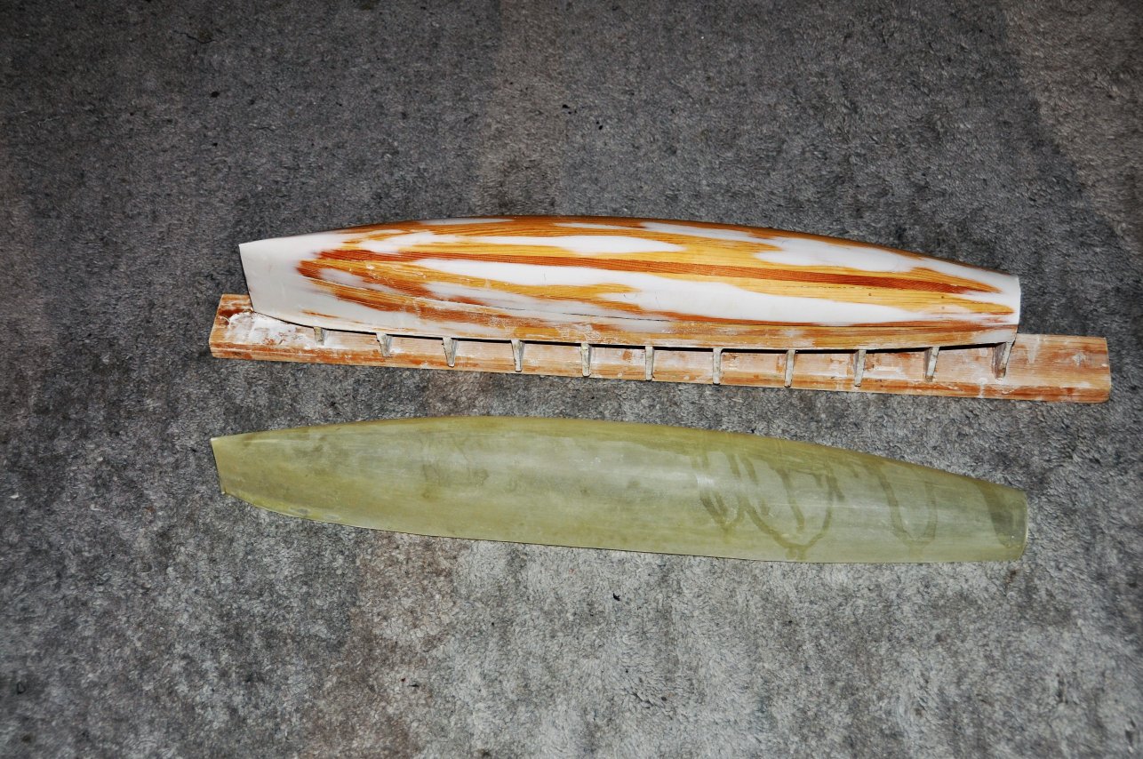 Obschon ich Bauweisen, wie das Drucken von Rümpfen oder ähnliche Verfahren, mit Interesse verfolge, erstelle ich meine Modelle relativ konventionell. Ein herkömmlicher Holzrumpf, im vorliegenden Fall geschliffen und gespachtelt bildet dabei die Grundlage. Nach einer mehrfachen Behandlung mit Trennmittel, werden die zugeschnittenen Glasfasergewebe-Lagen über den Rumpf gelegt und mit Epoxydharz getränkt. Auf den Bau einer Negativform verzichte ich bewusst. Durch diese Bauweise muss die Aussenseite der Rumpfschale noch kurz verschliffen werden. Diese Arbeit mache ich, solange die Schale noch nicht vom Rumpf getrennt wurde. Das Trennen der Schale vom Holzrumpf ist immer ein spannender Moment, der gefolgt wird, vom gründlichen Entfernen des Trennmittels. Für das zuverlässige Verkleben der weiteren Ausbauteile ein wichtiger Arbeitsschritt. Entsprechende Wasserspuren erkennt man auf der Innenseite der freiliegende Rumpfschale.