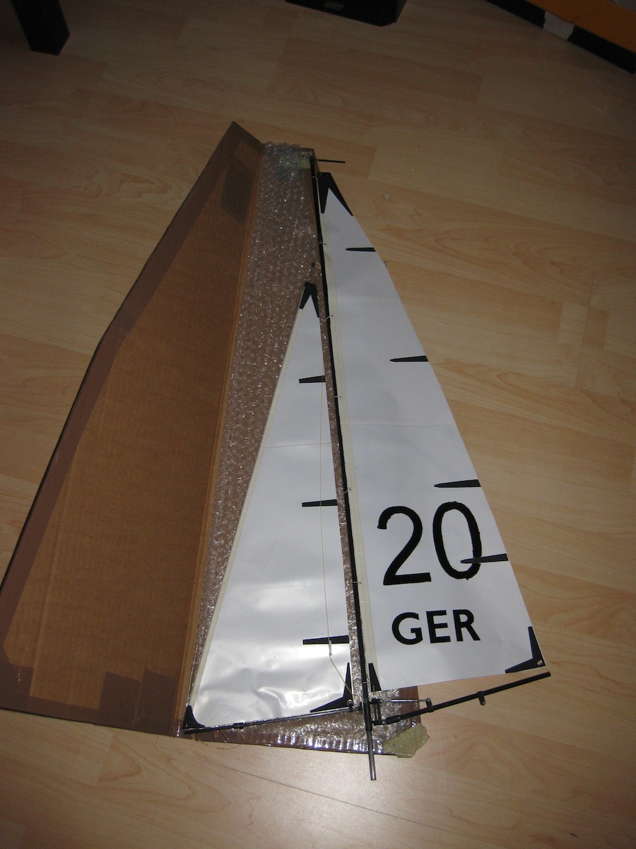 Graupner rMM Baumbeschlag, Mast 6/4mm Kohle. Das Schothorn vom Groß muss noch wieder am Baum angeschlagen werden und das Rigg für die eigene Schotführung angepasst werden. 50µ Folie, Segelnummer ist mit Edding reingemalt und kann entfernt werden.