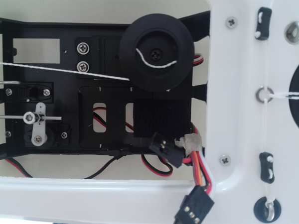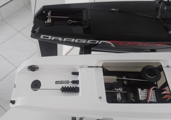Das neue Servobrett der V6 soll steifer als seine Vorgänger sein und sich weniger stark verwinden. Die Segelwinde hat die gleiche Position wie in der V5. Das Ruderservo ist von Backbord (Bb) nach Stb gewandert. Daher jetzt auch das Steuergestänge auf Stb. Der Empfänger bei der RTR Version sitzt nun vorne auf Stb. Bei der V5 hinten auf Stb. Der Empfänger ist mit selbstklebenden Klettband befestigt. Da ich die V6 mit meiner Graupner MX 12 steuern möchte, muss der Joysway Empfänger weichen.