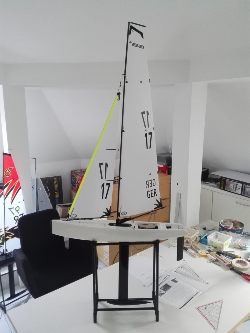 Vorher habe ich das von der Anleitung verlangte Mastfall korrekt auf 75 cm eingestellt. Gemessen vom Bugfender zur Fockaufnahme. Dies kann man über sensibles verschieben der Mastfußplatte erreichen.