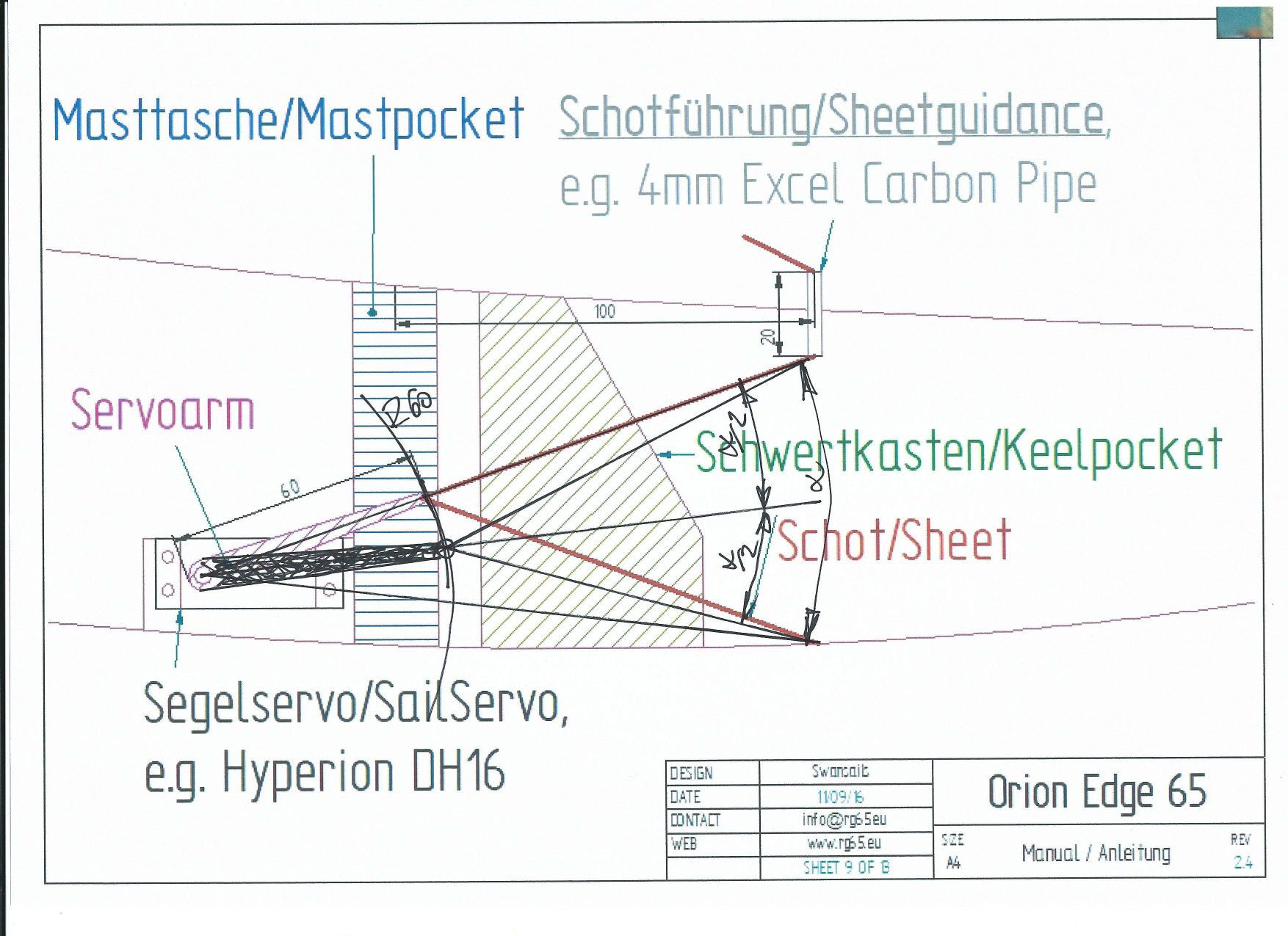 Es kommt auf die richtige Einstellung der Schotwege und Nullpunkte an. Am wichtigsten ist das in der Vorwindposition KEIN Druck auf dem Servomotor ist. Ich erkläre das mal am Beispiel meiner Schotführung die ich seit Jahren verwende (mir ist noch nie ein Segelservo kaputt gegangen ;) ). Man kann das Prinzip aber auch auf die meisten anderen Aufbauten übertragen. Hier ein Bild aus der Aufbauanleitung der Orion Edge: