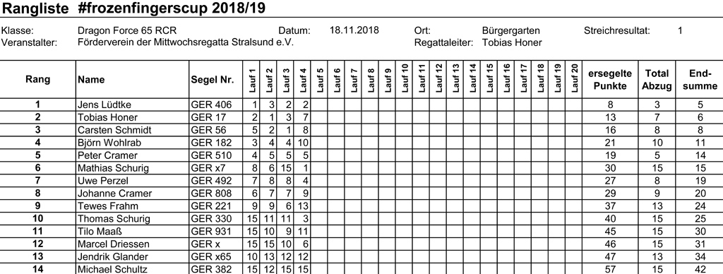 Ergebnisse auf der Facebookseite #frozenfingerscup und dem RG65 Forum.