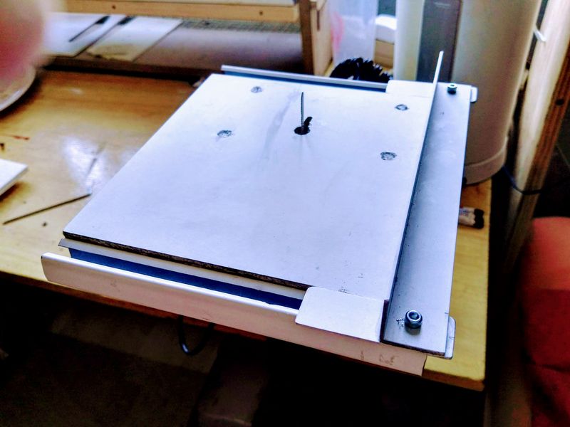 Die Stichsäge wird zum Betrieb unter den Tisch geklemmt und dann mittels eines Universalgerätehalters von Proxxon in meinen Modellbauschraubstock gespannt.