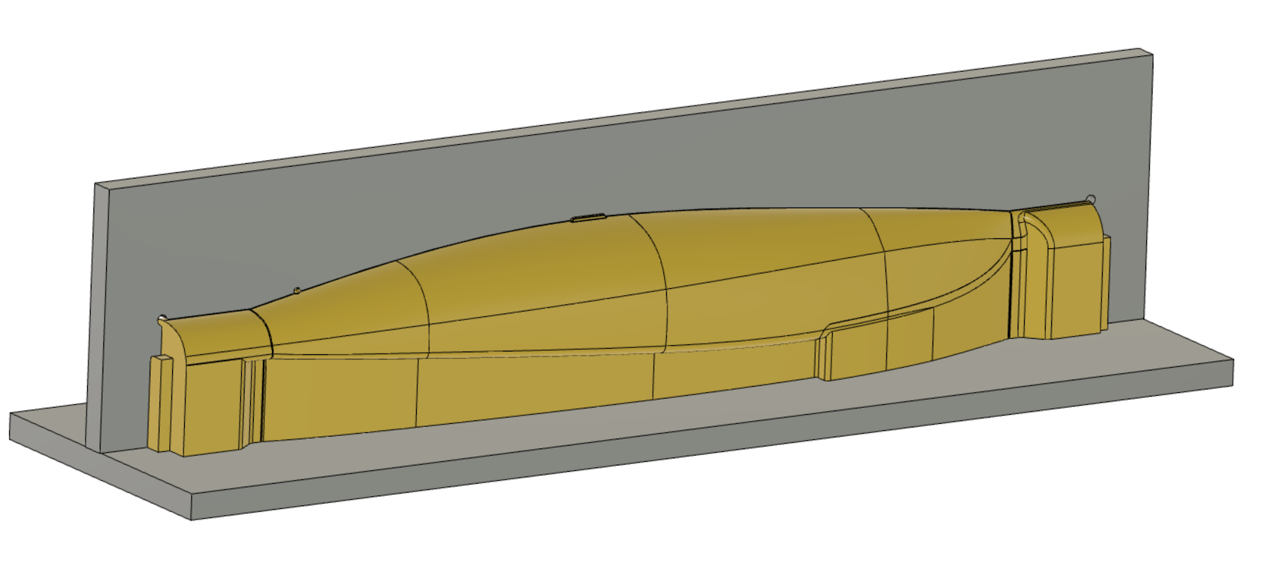 Die Konstruktion der Formen beginnt beim Rumpf und der Trennung Rumpf-Bughaube. Die Rumpfhälften (Negativformen) entstehen dann aus dem Positiv (3D-gedruckt in fünf Teilen) und aus einem Trennbrett zur Herstellung der Form. Hier ein paar Details illustriert mit Bildern zur Form für die Rumpfhälften.