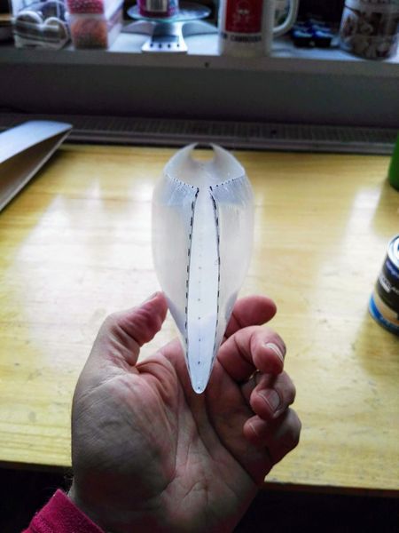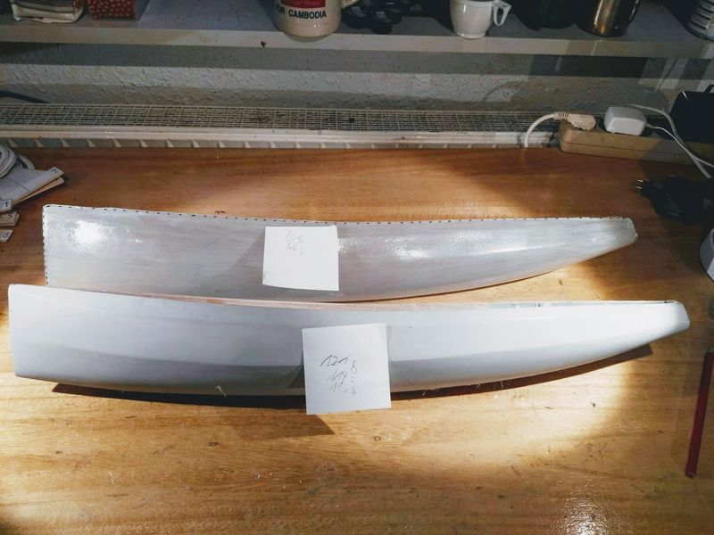 Jetzt habe ich also zwei Rümpfe zur Verfügung, werde aber wie geplant mit dem Holzrumpf weiter machen. Der wiegt übrigens 113 g. Das ist wohl dem 83er Glas und dem damit verbundenen dickeren Harzauftrag geschuldet. Dafür ist der Rumpf vermutlich robuster und somit bin ich durchaus zufrieden mit meinem ersten Werk.