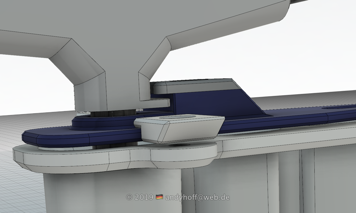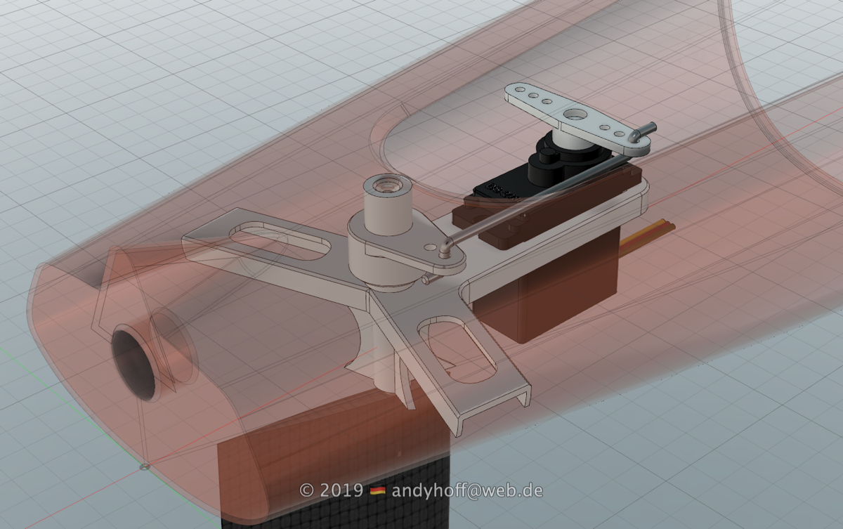 Das ganze ist sehr stabil und passt ausgezeichnet. Servo wird erst in den Halter eingeschnappt und dann mit der vorderen Klammer&Schraube endgültig gesichert. Die kleine seitliche Schraube ist eigentlich unnötig. Aber ich habe dafür trotzdem eine Bohrung vorgesehen.