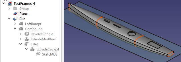 D.h. ich kann jederzeit einen der Spanten auswählen, in den Sketcher gehen, an seinen Linien rumschieben, bemaßen, Hilfslinien, Constraints setzen und dann nach Verlassen des Sketchers meine Korrekturerfolge begutachten.