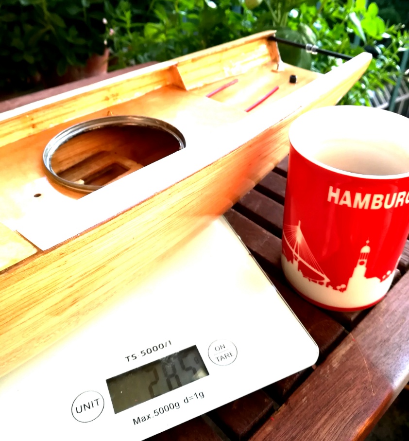 Das erreichte Rumpfgewicht sollte wohl passen, ist das Boot doch auf eine Verdrängung von 1200gr. konstruiert und trägt mehr Segelfläche als unsere RG.