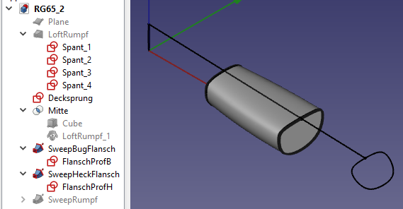 habe ich mal einen Deckssprung = 0 generiert. Die fragliche Linie = SweepPfad orientiert sich an den beiden mittleren Spanten, wo auch die externen Referenzen für die Flansche liegen.