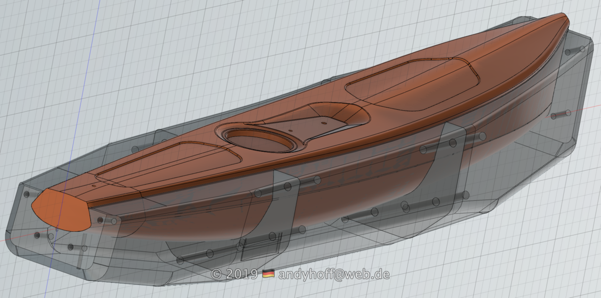 Muss ich also wohl doch nochmal alles ummodeln und wie gehabt in der Symmetrie / Mittellinie trennen. Dann gleich den Deckradius + Bug- Achterdeck mit in die Formhälften nehmen und nur eine kleine Form zum aufstecken für das CenterDeck.