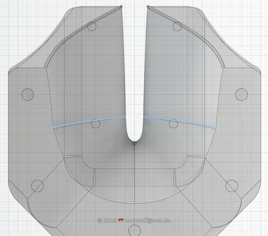 Wenn ich die Trennung hier entlang der markierten blauen Linie mache und dann der obere Teil zur Deckform gehört hab ich da ja das gleiche Problem. Zwar nicht ganz so stark wie am Heck .. aber trotzdem ein Hinterschnitt.