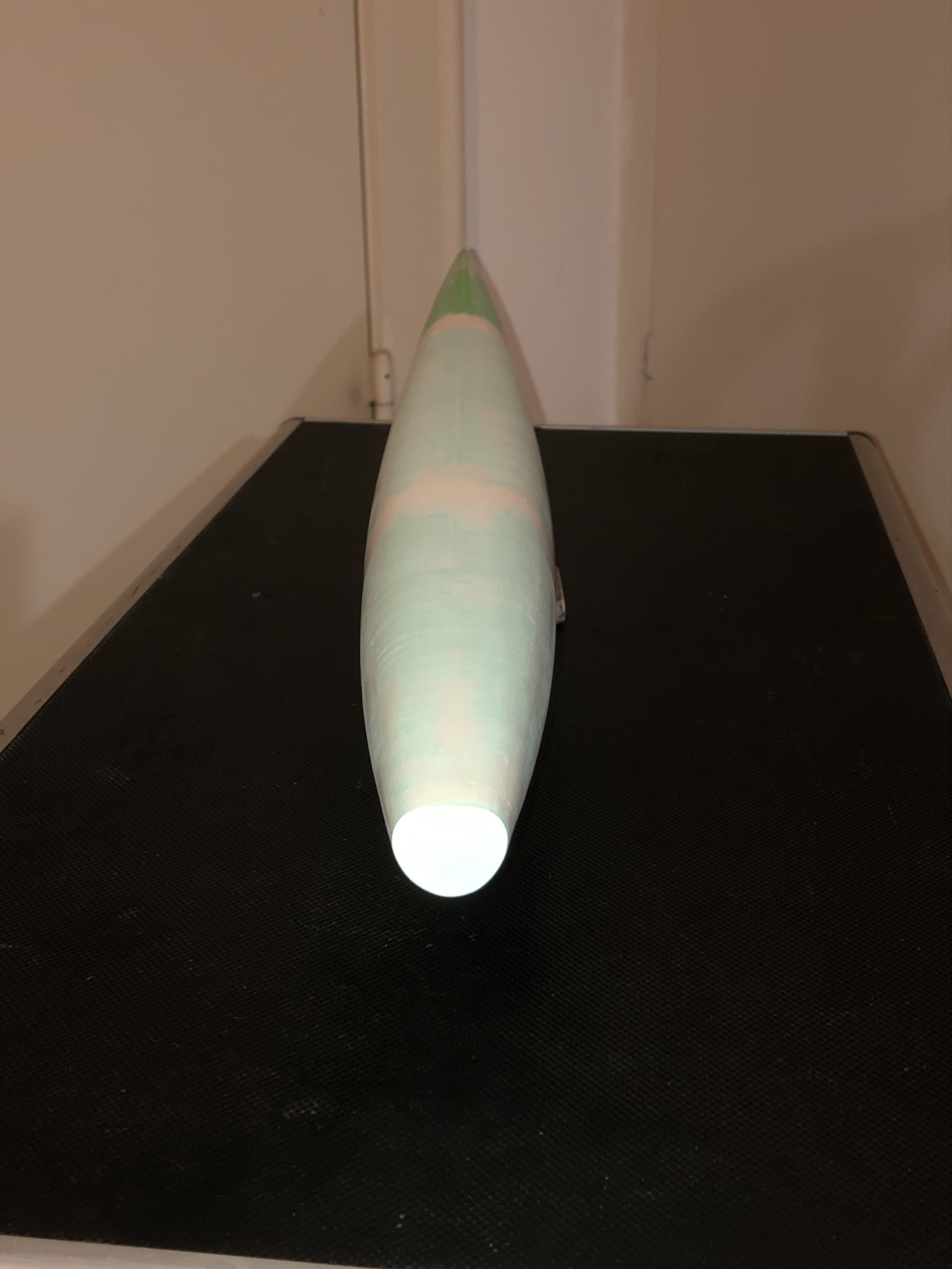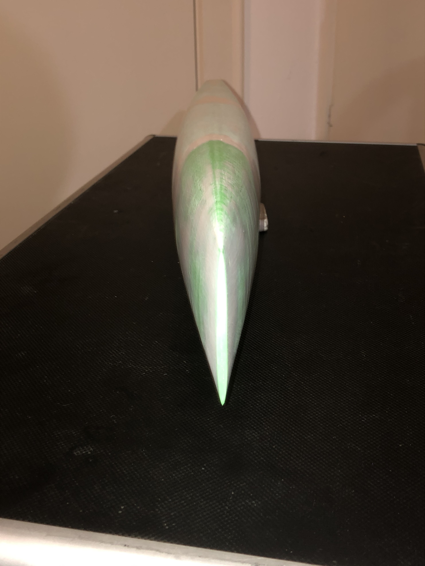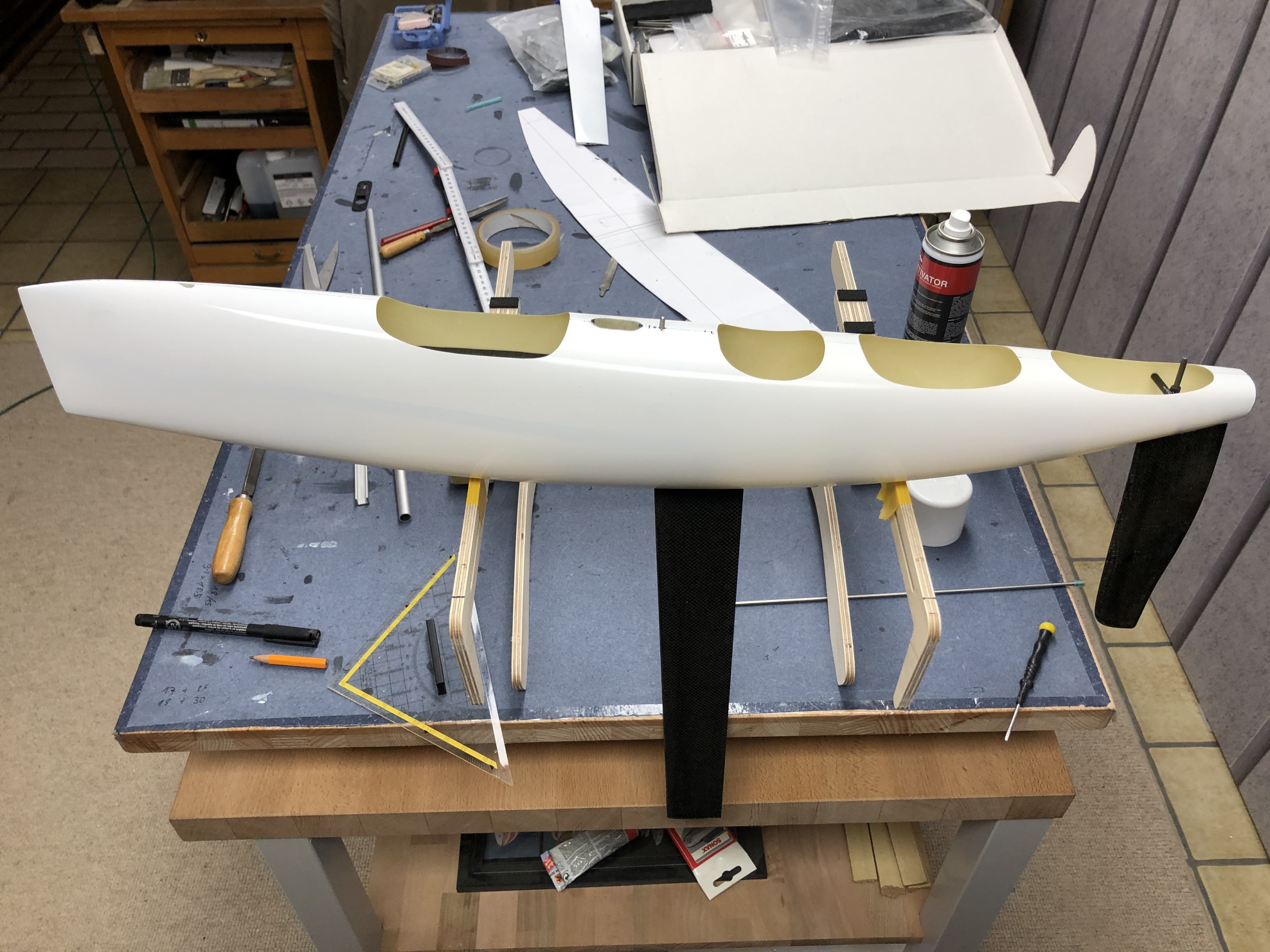 Der Rumpf ist aus 2 Lagen 105er Glas laminiert und hat vorne auf den ehr graden Flächen eine Roving in Längsrichtung zur Verstärkung erhalten. Ferner sind auch Rovings in den Kanten der Nase zur Ausrundung dieser für das laminieren. Zuvor wurde aber einmal Farbe aus der Dose in die Form gespritzt für ein besseres oberflächenfinish. Der Rumpf bringt so ohne Ausschnitte 82g au die Waage und ist ausreichend stabil.