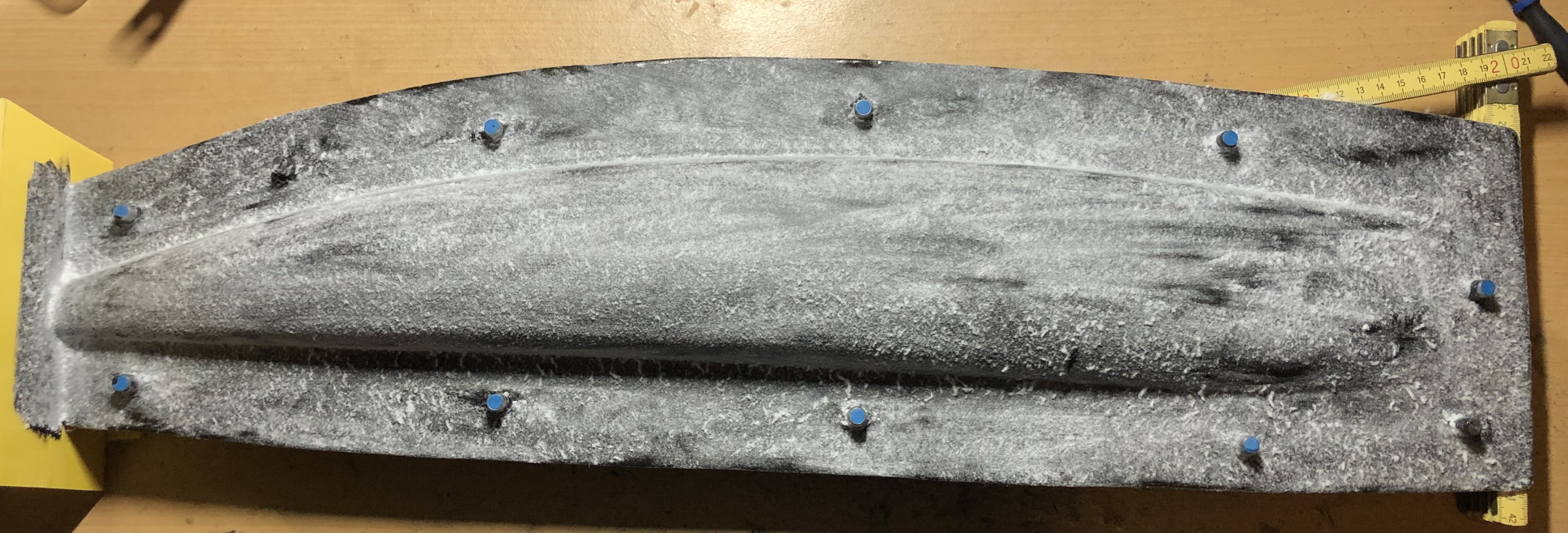Ruder und Flosse sind auch selbst laminiert in Formen, die ich von einem sehr bekannten ehemaligen Kielgewicht Hersteller bekommen habe. Die Kieltasche habe ich direkt vom fertig Schwert abgenommen durch überlaminieren nach vorheriger Behandlung mit PVA Folientrennmittel. Für die Masttasche habe ich mir eine Vorrichtung gebaut auf der ich eine Halbschale laminieren kann, zusammengefügt bietet die später eine Verstellbereich des Mastes von 12mm insgesamt.