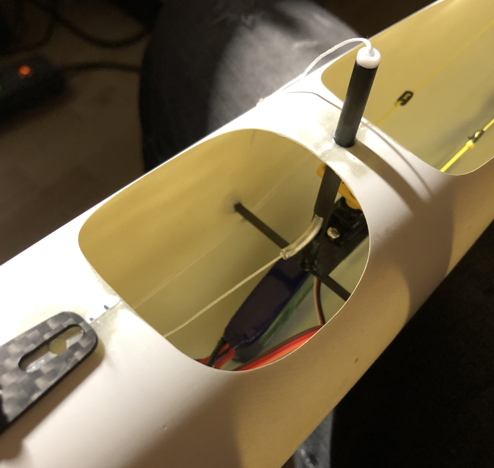 Wie auch schon bei meiner Manta kamen HV Servos zum Einsatz, die mit einem 2s Lipo klar kommen. Fürs Ruder ist das ein Hepf H60 mit 10g und für die Segelverstellung ein Graupner HVS 933 BB MG mit ca. 30g, welches die gleichen Abmessungen und technischen Daten hat wie das gerne verwendete Graupner DES 678 nur halt für die höhere Spannung. Als Stromversorgung verwende ich 2s Lipos mit 300 - 450mAh aus der Indoorfliegerei, welche nicht mehr als 30g auf die Waage bringen und direkt an den Empfänger angeschlossen werden. Alles wurde dann mit möglichst wenig Materialeinsatz und so tief wie möglich im Rumpf verbaut, wie man auf den Bildern gut erkennen kann.